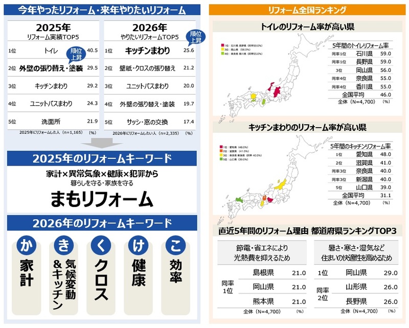 ・2026年にリフォームしたい場所TOP3 キッチンまわり「和歌山県」「大分県」「愛媛県」。壁紙・クロスの張り替え「福岡県」「奈良県」「千葉県」。ユニットバスまわり「滋賀県」「宮城県」「富山県」。外壁の張り替え・塗装「鹿児島県」「高知県」「千葉県」。サッシ・窓の交換「福岡県」「島根県」「和歌山県」。