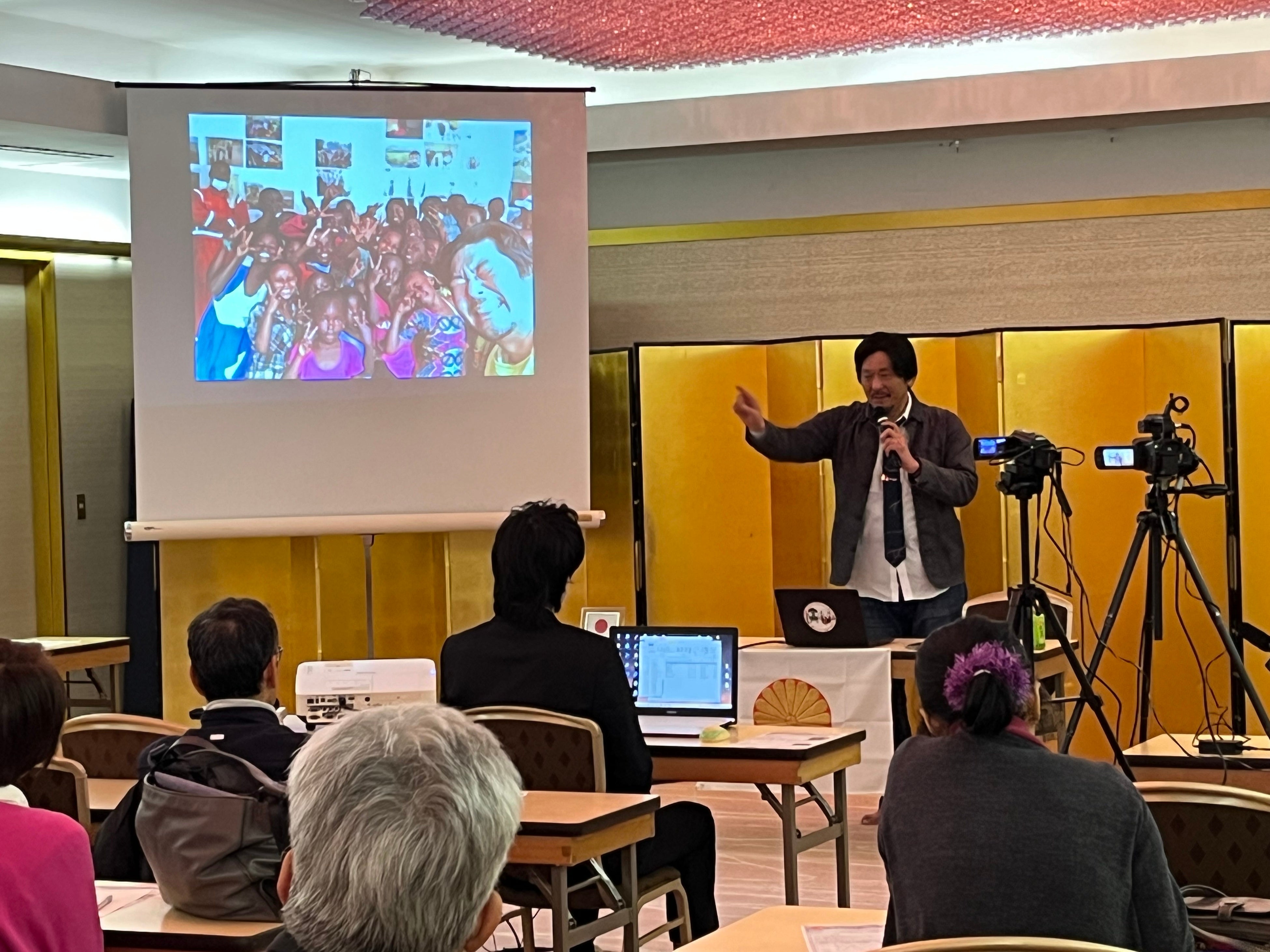 講演では、なかよし学園がこれまで行ってきた南スーダン難民キャンプ、コンゴ民主共和国の少年兵更生施設、ルワンダやシリアなど紛争・災害地域での授業の様子を写真と動画で紹介しました。