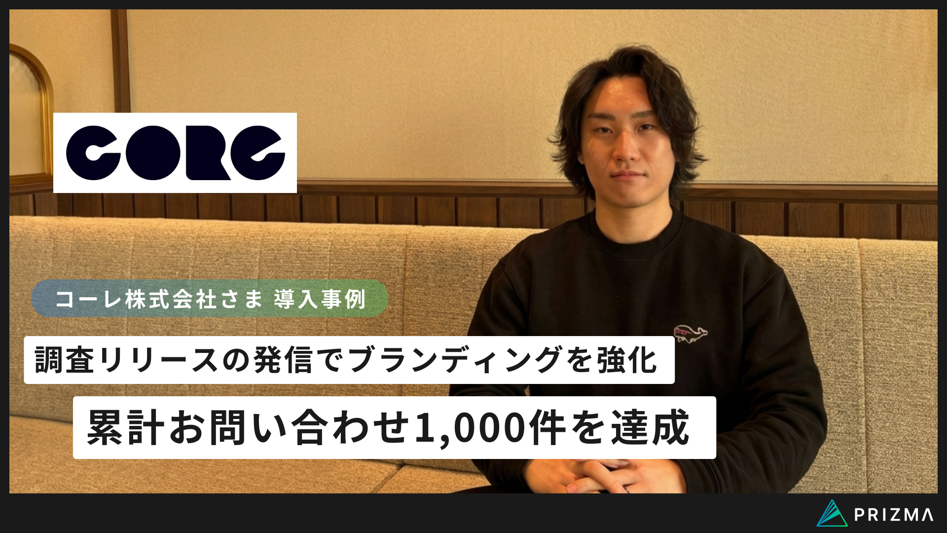 株式会社PRIZMA(本社:東京都渋谷区、代表取締役:杉本 昂輝)は、AIの戦略設計から本番実装・運用定着、人材育成、事業化までを一貫して支援するコーレ株式会社(本社:東京都新宿区、代表取締役:奥脇 真人)が、株式会社PRIZMAの提供する「調査リリース」サービスを活用し、ブランディング強化と営業資料などへの二次利用を実現したことをお知らせします。