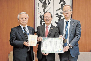 認定を報告しようと、関西電力の三澤誠北陸支社長が、飛騨市森林組合の上川渡福雄代表理事組合長とともに市役所を訪れた。三澤支社長は「水力発電をする上で自然は大切。地域のため微力ながらお役に立てれば」と話し、都竹淳也市長は「自然を守る大切さを改めて認識していただけるもの」と取り組みに対する感謝を述べた。