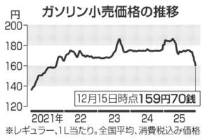 ガソリン160円下回る 全国平均、4年3カ月ぶり 2025年12月18日 05:00 経済産業省が17日発表した15日... 残り556文字(全文:573文字) この記事をお読みいただくには「デジタルプラン」または「宅配+デジタルプラン」の会員登録が必要です。無料会員の方はログインしてマイページからコース変更してください。デジタルプランまたは宅配+デジタルプランをご登録中の方はログインしてください。 岐阜新聞デジタル会員に登録すると 無料会員向け記事が読める ニュースレターで最新情報が受け取れる デジタルプラン、宅配+デジタルプランなら Webオリジナルコンテンツが読める 紙面ビューアが読める チケットの先行発売に参加できる お得なクーポンが使える 新規登録ページ ログインページ トップ 岐阜のニュース ガソリン160円下回る 全国平均、4年3カ月ぶり 関連記事 モーニング、キャラメリゼのフレンチトースト人気 岐阜・瑞浪市のカフェ 「正月菜」収穫ピーク 岐阜県内の生産量9割占める神戸町 FC岐阜・西谷がJ3優秀選手賞に選出 今季8得点 【FC岐阜2025 苦闘の1年(中)】クラブ記録更新の7連勝 新体制、意識改革で浮上 労働遺産に「野麦峠工女」内定、高山の兄妹像やまつりも認定 労働ペンクラブ カーリング 混合複五輪最終予選 小穴・青木組連勝 1次L 5勝2敗で終える おすすめ記事 美濃加茂市の新庁舎整備地、条例改正案は薄氷の可決【各議員の採決の結果一覧掲載】 岐阜城で信長期の3段目の石垣発見 岐阜市の発掘調査、櫓や塀など造成か 本巣市に11階建てホテル建設へ 東海環状道西回り開通で需要見込む 岐阜市の自動運転バス、新車両の一般乗車スタートへ 来年1月下旬から