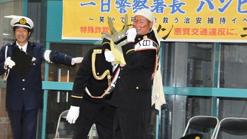 お笑いコンビ「バンビーノ」の石山タオルさんと藤田ユウキさんの2人が17日、岐阜県警可児署の一日署長を務めた。高木晃署長から委嘱を受けた2人は、特殊詐欺被害や交通違反防止を呼びかけた。