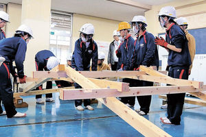 うち建設工学科の講座では、摩擦力で支える構造の橋「ダ・ヴィンチの橋」の作製に臨んだ。割り箸15本の小さな模型で強度を確かめた後、長さ2メートルの角材を使って作り上げた。中学生は高校生の助言を受けて建設現場さながらに役割を分担して組み上げ、支える力の強さに驚いていた。
