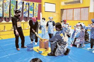 飛騨市古川町片原町の飛騨吉城特別支援学校の児童生徒と地元団体「殿町青龍会」の交流会が16日、同校で行われ、一緒に餅つきを楽しんだ。