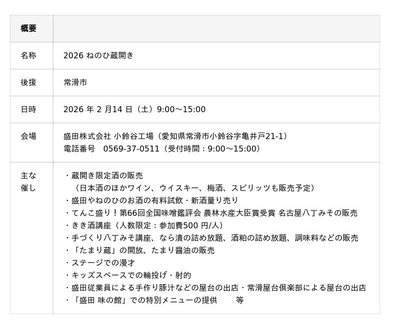 株式会社JFLA ホールディングス(本社:東京都中央区/代表取締役社長:檜垣周作)の子会社である 盛田株式会社(本社:愛知県名古屋市/代表取締役社長:檜垣周作、以下 盛田)は、2026年2月14 日(土)に、盛田 小鈴谷工場(愛知県常滑市)にて、盛田やねのひの日本酒販売をはじめ、子供から大人まで楽しめるイベントが盛りだくさんの「2026 ねのひ蔵開き」を開催いたします。