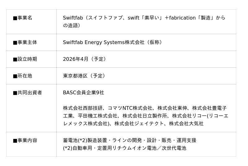 この度、BASCに加盟する設備関連企業の中の9社が蓄電池製造設備産業の強化に向け、共同事業体「Swiftfab Energy Systems株式会社(仮称、以下「当共同事業体」)」の設立に合意しました。