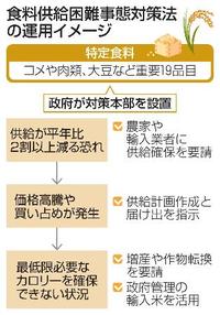 対策法は、大豆のほかコメや肉類など重要な計19品目を「特定食料」と規定。供給量が平年比で2割以上減少する恐れを最初のステージと位置づけ、深刻度に応じて対応策を取る。価格高騰や買い占めが発生した場合、政府は農家や輸入業者に供給確保のための計画作成と届け出を指示する。従わない場合は20万円以下の罰金を科す。