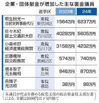 収支報告書によると、24年に最も多く企業・団体献金を集めたのは安倍派幹部だった萩生田光一幹事長代行の支部で6237万円。地元・東京都八王子市の企業が大半を占め、23年の1564万円を大きく上回った。