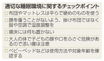 SIDSの発症率を下げるためには、1歳まであおむけで寝させることや、周囲でたばこを吸わないといったことが有効とされる。こども庁は窒息を防ぐために「硬めで平たんな寝具を使う」「顔を覆うことがないように服や空調で温度調整する」など、適切な睡眠環境の五つのチェックポイントも挙げている。