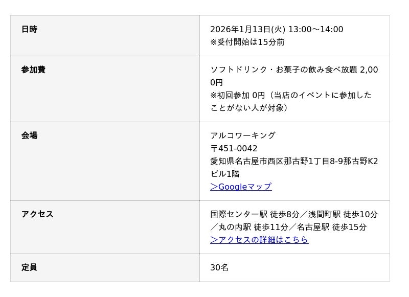 2025年1月13日(火) 13:00~14:00に、名古屋市のアルコワーキング(運営会社:室屋アフィリエイト合同会社、所在地:愛知県名古屋市西区那古野、代表:室屋清隆)にて、「アルコワビジネス交流会」が開催されます。
