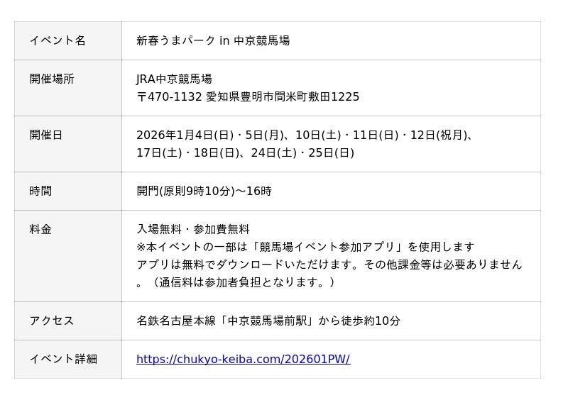 JRA中京競馬場では、新春イベントとして1月のパークウインズ営業日に家族みんなが楽しめるイベントを開催いたします