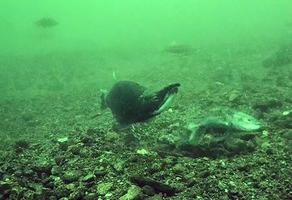 県によると、撮影に成功したのは今月2日で、水深約30m地点。メスが砂利を掘って産卵した後、つがいのオスが精子をかける姿や、サケの産卵行動にもみられる別のオスが割り込む様子を撮影した。