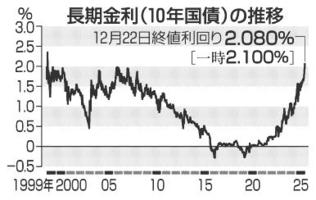 長期金利一時2・100% 99年以来 国債の売り加速 2025年12月23日 05:00 週明け22日の国債市場で、長期金... 残り535文字(全文:552文字) この記事をお読みいただくには「デジタルプラン」または「宅配+デジタルプラン」の会員登録が必要です。無料会員の方はログインしてマイページからコース変更してください。デジタルプランまたは宅配+デジタルプランをご登録中の方はログインしてください。 岐阜新聞デジタル会員に登録すると 無料会員向け記事が読める ニュースレターで最新情報が受け取れる デジタルプラン、宅配+デジタルプランなら Webオリジナルコンテンツが読める 紙面ビューアが読める チケットの先行発売に参加できる お得なクーポンが使える 新規登録ページ ログインページ トップ 岐阜のニュース 長期金利一時2・100% 99年以来 国債の売り加速 関連記事 予約殺到、道の駅で人気のアップルパイ最盛期 久々野特産リンゴ使用 陶芸家・荒川豊蔵の絵画紹介、可児市の資料館で企画展 志野陶片発見図も展示 岐阜県勢の活躍たたえ表彰 岐阜新聞スポーツ賞贈呈式 NOBUNAGA社と損保ジャパン協定締結 社会課題解決のスタートアップ支援 核融合実験で世界初成功 遠隔地からプラズマ温度制御 岐阜県内、26日から大雪恐れ 山地中心に平地も警戒 おすすめ記事 岐阜県勢の活躍たたえ表彰 岐阜新聞スポーツ賞贈呈式 【森嶋ルポ】日本一の強打の神髄伝授 Uー18前監督の小倉全由さん、今村新監督の中京で臨時コーチ 予約殺到、道の駅で人気のアップルパイ最盛期 久々野特産リンゴ使用 「夜」が岐阜市の観光を変える! 「日本3大山城夜景」が生む“泊まりたくなる町”とは