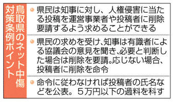 「投稿削除命令」を条例化 中傷対策 鳥取県、罰則も規定 2025年12月23日 05:00 交流サイト(SNS)などインター... 残り817文字(全文:834文字) この記事をお読みいただくには「デジタルプラン」または「宅配+デジタルプラン」の会員登録が必要です。無料会員の方はログインしてマイページからコース変更してください。デジタルプランまたは宅配+デジタルプランをご登録中の方はログインしてください。 岐阜新聞デジタル会員に登録すると 無料会員向け記事が読める ニュースレターで最新情報が受け取れる デジタルプラン、宅配+デジタルプランなら Webオリジナルコンテンツが読める 紙面ビューアが読める チケットの先行発売に参加できる お得なクーポンが使える 新規登録ページ ログインページ トップ 岐阜のニュース 「投稿削除命令」を条例化 中傷対策 鳥取県、罰則も規定 関連記事 マクドナルド、岐阜・海津市に15年ぶり復活で大行列 ファストフード空白地、市長も推進 元研修医わいせつ 懲役7年6月判決 岐阜地裁 還付金「知らない」 大野被告裏金公判 会計責任者証言 性暴力 教員のデータベース 自治体、学校7割未活用 採用時の確認義務守らず ロマンス詐欺2969万円被害 各務原市の70代女性 精神疾患で教員7087人休職 24年度、2年連続7000人台 岐阜は10人増113人 おすすめ記事 マクドナルド、岐阜・海津市に15年ぶり復活で大行列 ファストフード空白地、市長も推進 岐阜市の伝統校は商業教育も部活も全国トップ級! 生徒自ら会社経営も 「自走と伴走」で未来のリーダー育成 【ぎふ高校研究】 岐阜県内の観光消費額、過去最高を更新 2024年、4千億円超す 大垣の名所「カリヨン時計」15年ぶり復活 弘光舎本社ビルのからくり時計 2体の人形に歓声