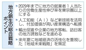 政府は23日の閣議で、2029年度までに取り組む地方創生の総合戦略を決定した。地方の就業者1人当たりの労働生産性伸び率を、29年までに東京圏(埼玉、千葉、東京、神奈川)以上にする目標を掲げた。人工知能(AI)など新技術の活用を通じた付加価値が高い産業構造への転換を強調しており、来年夏をめどに、地域経済の活性化を重視した「地域未来戦略」も策定する。
