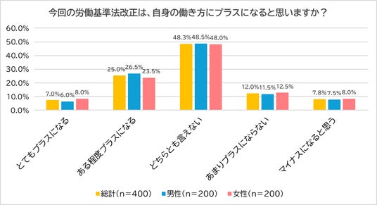 最後に、「今回の労働基準法改正は自身の働き方にプラスになると思うか?」と尋ねたところ、「どちらとも言えない」(総計:48.3%、男性:48.5%、女性:48.0%)と回答した人が最も多く、全体の約半数を占めました。「とてもプラスになる」(総計:7.0%、男性:6.0%、女性:8.0%)、「ある程度プラスになる」(総計:25.0%、男性:26.5%、女性:23.5%)と前向きに捉える人は3割超存在するものの、「あまりプラスにならない」「マイナスになると思う」と感じている人も少なくありませんでした。