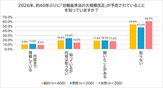 「2026年、約40年ぶりに『労働基準法の大規模改正』が予定されていることを知っているか?」と尋ねたところ、「知らない」(総計:53.8%、男性:47.0%、女性:60.5%)と回答した人が過半数を占めました。男女別に見ると、男性の方が認知度はやや高いものの、「内容まで理解している」(総計:9.8%、男性:11.0%、女性:8.5%)は約1割と低い結果となり、働き方に直結する法改正でありながら、当事者には十分な情報が届いていない現実が浮き彫りになりました。