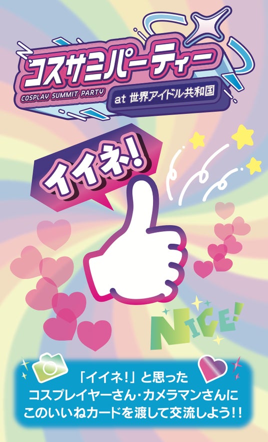 世界コスプレサミットでは、イベントに新たなコミュニケーション企画「いいねカード」 を導入します。これは、コスプレイベントの楽しみ方をより広げるためにWCSが独自に開発した、コスプレイヤー同士・そしてコスプレファン(フォトグラファー、コスプレ好き)の方々も気軽に交流を楽しめるツール です。