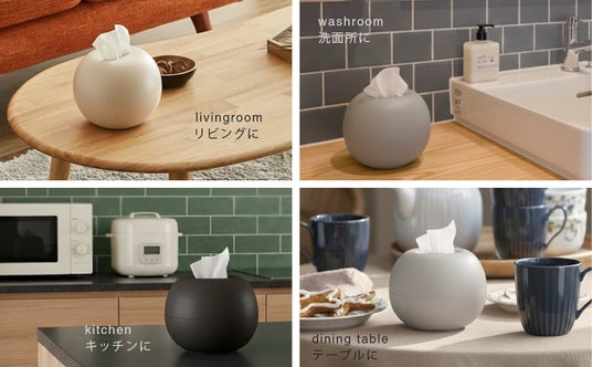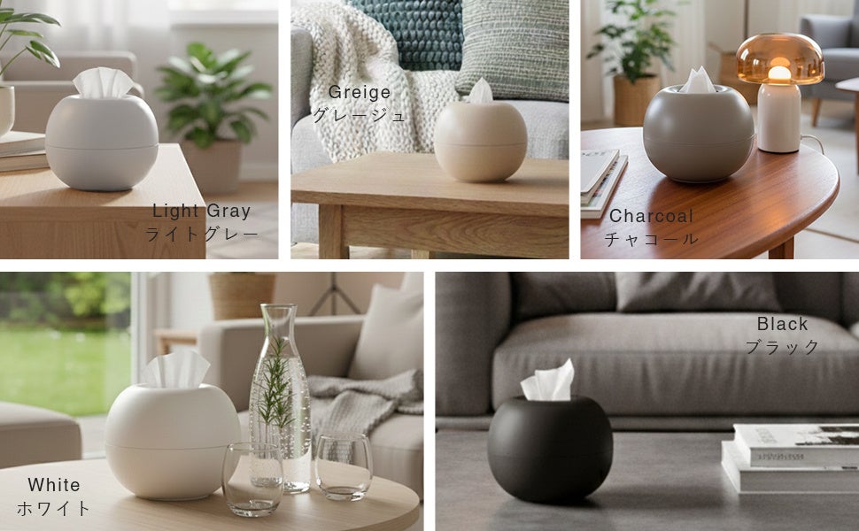 リンゴのように丸みを帯びたフォルムが特長で、日用品でありながら“見せたくなる”デザインを実現。リビングや洗面所、トイレ、デスク周りまで、空間をさりげなく彩るインテリアアイテムとしてお使いいただけます。