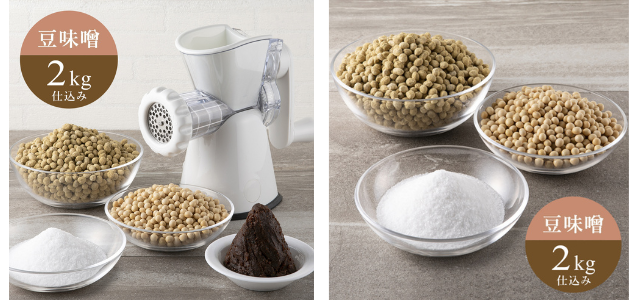 ミンサー付豆味噌セットと、原材料のみ豆味噌セット2kg仕込みの2種類をご用意しております。