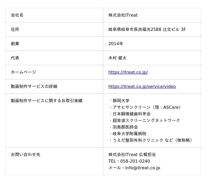 医療機関向けのWeb制作・マーケティング支援を行う株式会社ITreat(本社:岐阜県岐阜市)は、近年ニーズが高まっている動画制作サービスにおいて、多くの医療機関からご好評をいただいています。