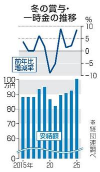 経団連が24日発表した大手企業の冬の賞与・一時金(ボーナス)集計によると、平均妥結額は昨冬と比べ8・57%増の100万4841円で、過去最高だった。比較可能な1981年以降で、100万円を超えるのは初。好業績を背景に、高い賃上げ率が続いたほか、業績連動の支給を増やす企業も多かった。