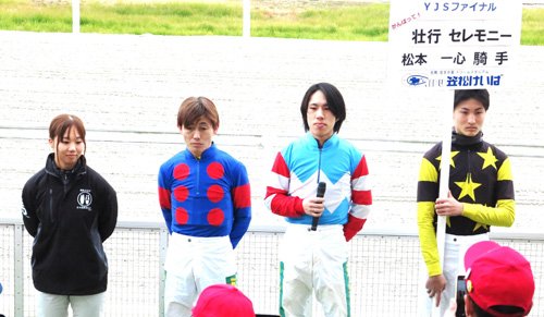 勝負服が同柄という巡り合わせで「『優勝を目指して頑張ってきて』と言ってくれた石堂さんのおかげで勝てました」とも。2年目の今年「門別(期間限定騎乗)で積極的な競馬ができ、YJSでもできたので良かったです」。地方女性騎手の快挙に「うれしいです。馬も結構動いてくれて。JRAで勝てたのは自信につながります」と歓喜に浸った。最終順位は総合6位だったが、今後の飛躍へとつながる大きな1勝となった。