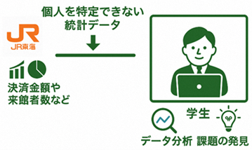 ・内容:学生がJR東海グループの売上データを分析し、ビジネスで求められる仮説設定やデータ分析を通じた課題発見、その解決策となる新規事業提案等を行う。