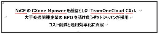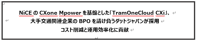 AIを活用したセルフサービスとオペレーター支援型CXソフトウェアの世界的リーダーである NiCE(NASDAQ: NICE、日本法人 ナイスジャパン株式会社 社長 オリビエ・ジオレット 以下 NiCE)は 、ダットジャパン株式会社(以下 ダットジャパン)が、国内大手の交通関連企業から委託されるコールセンター業務において、NiCE のクラウド CX プラットフォーム「CXone Mpower」を基盤とした、トラムシステム株式会社が提供する OEM ソリューション「TramOneCloud CXi」を採用し、丸紅I-DIGIOグループ・丸紅情報システムズを含むベンダー各社の連携で短期間でのシームレスな移行と大幅なコスト削減・運用効率化を実現したことを発表いたします。