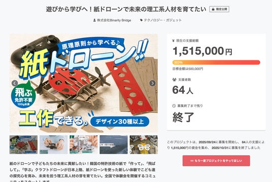 株式会社Binarity Bridgeでは、「COCODRONE」がこの課題解決の一助になると確信すると共に、日本全国の各現場で子どもたちにこの学びを届けていくコミュニティ「クラフトドローンコミュニティ」を立ち上げるべく、本クラウドファンディングを立ち上げ、2025年9月24日から2025年10月31日の間に支援者を集め、目標金額の303%で目標達成しました。