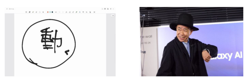 イベント当日は、Samsung Galaxyのリアルユーザーである木梨憲武さんがゲストに登場。Galaxy AIのスケッチアシスト機能「AIスケッチ」を使ったアート制作や、Gemini Liveを使って作詞した楽曲制作とCM撮影の舞台裏を語っていただき、Samsung Galaxyの端末を利用して誰もが簡単にアートや音楽を楽しめることを伝授していただきました。