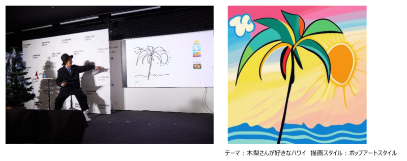 招待客から事前に募集したテーマの中からランダムに選ばれたお題に沿って、Samsung Galaxyを使用した即興アート制作に挑戦するアートワークショップ体験が行われました。木梨さんがその場で描き上げたスケッチにGalaxy AIのスケッチアシスト「AIスケッチ」機能を活用することで、簡単かつ表現豊かなアート作品へと仕上がりました。