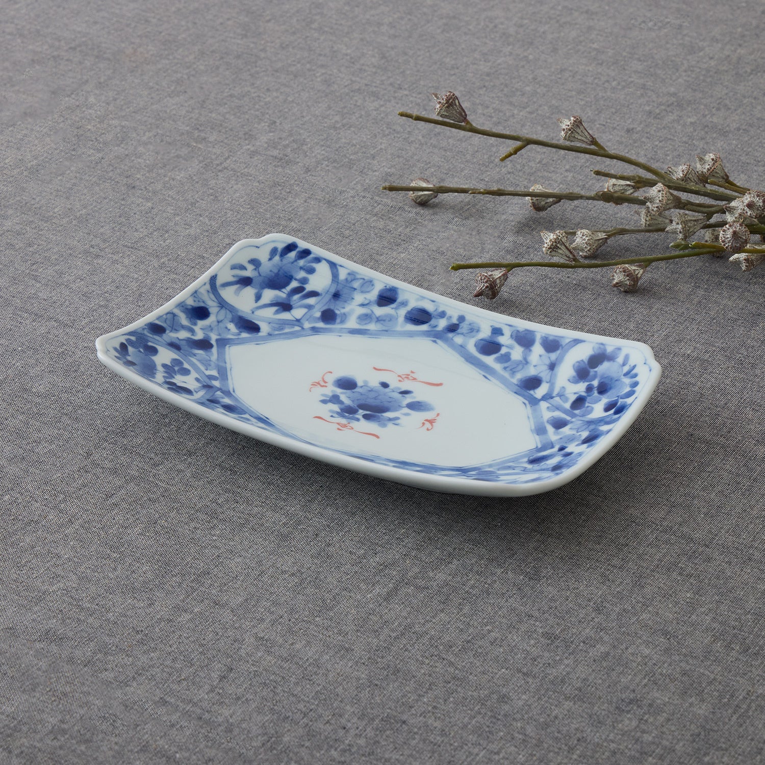 四隅にアクセントのある長角皿で、古伊万里をイメージした華やかな間取小花柄が施され、縁が立ち上がった使いやすい形状で、取り皿として毎日の食卓に彩りを添えるサイズです。
