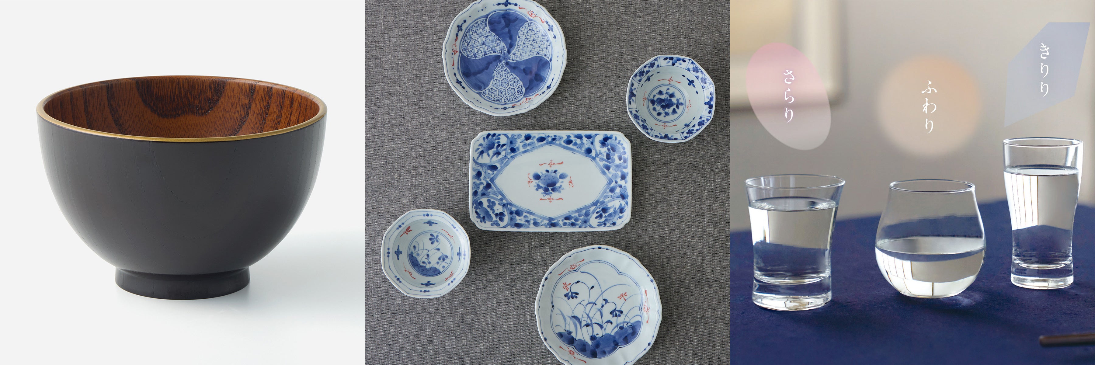 美濃焼の「赤絵シリーズ」は、縁起の良い形状と伝統柄を取り入れ、赤絵のアクセントで食卓を華やかに彩ります。八角鉢、深プレート 、長角皿はいずれも縁が立ち上がった使いやすい形状で、取り皿や副菜、デザートまで幅広く対応。毎日の食卓に、華やかさと実用性を兼ね備えた器です。 また、「飲み口変わるお酒グラス ふわり/さらり/きりり」は、グラスの形状によって異なる日本酒の味わいを楽しめます。お正月はとっておきの日本酒を嗜みながら、おせち料理を味わうのもおすすめです。