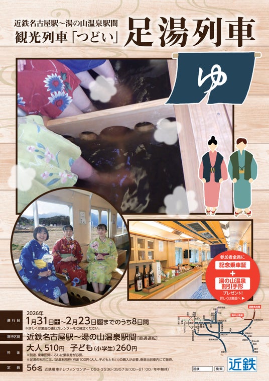 近畿日本鉄道株式会社、三重県菰野町および(一社)菰野町観光協会は、観光列車「つどい」の車内で足湯体験ができる「足湯列車」を、昨年度に引き続き今年度も運行します。