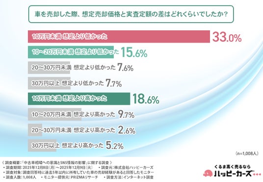 「車を売却した際、想定売却価格と実査定額の差」を尋ねたところ、『10万円未満 想定より低かった(33.0%)』と回答した方が最も多く、『10万円未満 想定より高かった(18.6%)』『10~20万円未満 想定より低かった(15.6%)』と続きました。