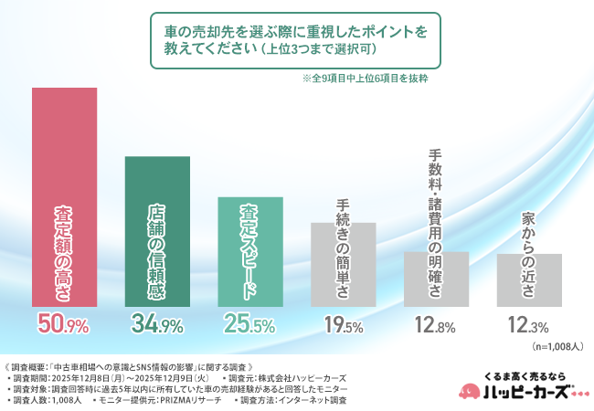 「車の売却先を選ぶ際に重視したポイント」について尋ねたところ、『査定額の高さ(50.9%)』と回答した方が最も多く、『店舗の信頼感(34.9%)』『査定スピード(25.5%)』と続きました。