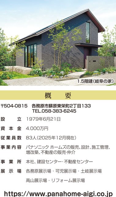 パナソニックホームズでは、地域の特性に合わせた暮らしを提案する「日本の家」プロジェクトを行っています。岐阜は、好調な平屋と、世界遺産・白川郷の合掌造りの屋根を掛け合わせたイメージで、角度のある大屋根が目を引く1・5階建ての岐阜の家を企画し、昨年5月には岐阜市内に街かどモデルハウスを設けました。ここを拠点に、この地域に合った家の魅力を積極的に発信していきたいです。
