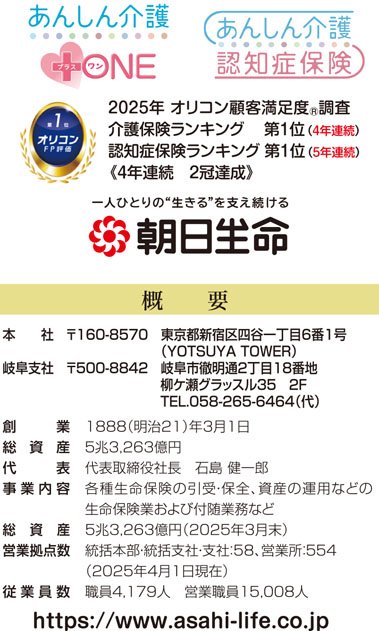 おかげさまで、オリコン顧客満足度調査では、ファイナンシャルプランナーが選ぶ商品ランキングで、介護保険と認知症保険がともに第1位となり、4年連続で2冠を達成しました。今後も「介護保険の普及は当社の社会的使命」との認識の下、介護への不安を「あんしん」に変えるために、先進的な介護保険の開発・販売・サービスの提供に取り組んでまいります。