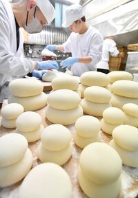 同店では、地下からくみ上げた水にもち米を半日ほど浸し、蒸して機械でつく。末広がりの「八」がつくため縁起がいいとされる28日から30日までがピークで、早朝からアルバイトを含む25人が作業する。寺社や企業、ホテルなどに出荷するほか、店頭でも個人客向けに販売する。