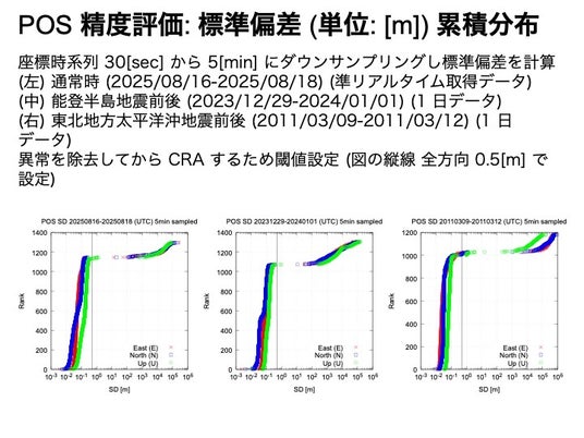 図4:5分間隔の地殻変動データの解析の誤差解析。米国ネバダ大学に後から公開されたデータ(NGL 5min final、後処理のため準リアルタイム解析は不可能)と比較して、ほぼ一致した測位結果を準リアルタイムで示しています。