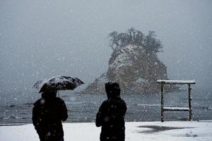 同県珠洲市の景勝地として知られる「見附島」前の海岸では、次第に雪がやみ晴れ間が見えると、朝日を見に近隣住民が集まった。地震で親戚3人を亡くし、近くの仮設住宅で暮らす70代女性は「時間がたつにつれ亡くなったことを実感し、悲しみが深くなってきた。今年は一歩でも前進できる年になれば」と願った。