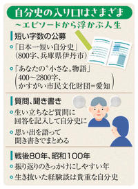 一歩踏み出す思い出整理 ●自分史の入り口 自治体などが毎年公募 2026年1月5日 05:00 半生を振り返る自分史は一人一人異... 残り660文字(全文:677文字) この記事をお読みいただくには「デジタルプラン」または「宅配+デジタルプラン」の会員登録が必要です。無料会員の方はログインしてマイページからコース変更してください。デジタルプランまたは宅配+デジタルプランをご登録中の方はログインしてください。 岐阜新聞デジタル会員に登録すると 無料会員向け記事が読める ニュースレターで最新情報が受け取れる デジタルプラン、宅配+デジタルプランなら Webオリジナルコンテンツが読める 紙面ビューアが読める チケットの先行発売に参加できる お得なクーポンが使える 新規登録ページ ログインページ トップ 岐阜のニュース 一歩踏み出す思い出整理 ●自分史の入り口 自治体などが毎年公募 関連記事 岐阜第一、全国初勝利を後輩に託す/県岐阜商、王者相手に奮闘 全日本高校バレー デンソーが8強 全日本バスケファイナルR 競馬 JRA年度代表馬にフォーエバーヤング 箱根駅伝 けが明けでも区間新樹立 駒大佐藤最後に意地 卒業後は米国へ 久保、新年初戦で好感触 「気持ちいいアシスト」 成績不振で監督解任 チュニジアW杯へ暗雲 おすすめ記事 福女チャレンジ111人激走、初代「最強の福女」決まる 恵那市の神社で初開催 岐阜市中心市街地の空洞化、官民の認識に差 街角では諦めも【県都はいま ’26岐阜市長選(1)】 高山市民に1万3000円商品券配布へ 市長「おこめ券、最初から選択肢外」 神谷そら選手、原点のゴルフ場に恩返し 整備用具寄贈「後輩に使ってもらえたら」