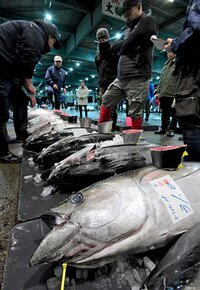 午前5時のサイレンとともに競りが始まると、集まった仲買人らがマグロの状態をじっくり見ながら次々に競り落としていった。...