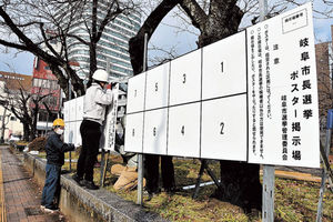 ’26岐阜市長選 ポスター掲示板設置 準備着々 25日告示 2026年1月6日 05:00 ポスター掲示板を設置する業者=岐阜市美江寺町、美江寺公園 任期満了に伴う岐阜市長選と議員辞... 残り223文字(全文:240文字) この記事をお読みいただくには「デジタルプラン」または「宅配+デジタルプラン」の会員登録が必要です。無料会員の方はログインしてマイページからコース変更してください。デジタルプランまたは宅配+デジタルプランをご登録中の方はログインしてください。 岐阜新聞デジタル会員に登録すると 無料会員向け記事が読める ニュースレターで最新情報が受け取れる デジタルプラン、宅配+デジタルプランなら Webオリジナルコンテンツが読める 紙面ビューアが読める チケットの先行発売に参加できる お得なクーポンが使える 新規登録ページ ログインページ トップ 岐阜のニュース ’26岐阜市長選 ポスター掲示板設置 準備着々 25日告示 関連記事 八百津せんべい、優しい味わい 趣向を凝らし多様な食感 手話サークル「竹の子」と泉中吹奏楽部が「とき☆キラリ賞」受賞 土岐商議所互礼会 会頭、4事業に意欲 植物学の歴史たどる 各務原市のくすり博物館で企画展 牧野富太郎作成の図鑑など展示 「政治参加を」伝える書 岐阜市「明るい選挙啓発書道」展示 創作の原点、「特別な土地」中津川・付知で原画展 絵本作家の村上康成さん こども園にラップ式トイレ 下呂市、災害時の断水に対応 おすすめ記事 ひな人形商戦ピーク 今どきの人気は? 岐阜県内の人形店 「ナイトタイムエコノミーを充実」観光振興へ 岐阜商工会議所が新春会見 【名将流儀】プロ投手を何人も育成 原点は守備中心の機動力野球 田口聖記さん【ぎふ高校野球】 丸善の創業者・早矢仕有的(山県市出身)の生涯たどる 東京・丸の内本店で企画展