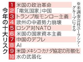 【ニューヨーク共同】国際的な地政学リスクを分析する米調査会社ユーラシア・グループは5日、今年の世界の「十大リスク」に関する報告書を発表した。トランプ米大統領が自らの権力へのチェック機能を組織的に解体、政府機構を掌握し、それを敵に対する武器として利用していると指摘した。こうした「米国の政治革命」を今年最大のリスクとした。