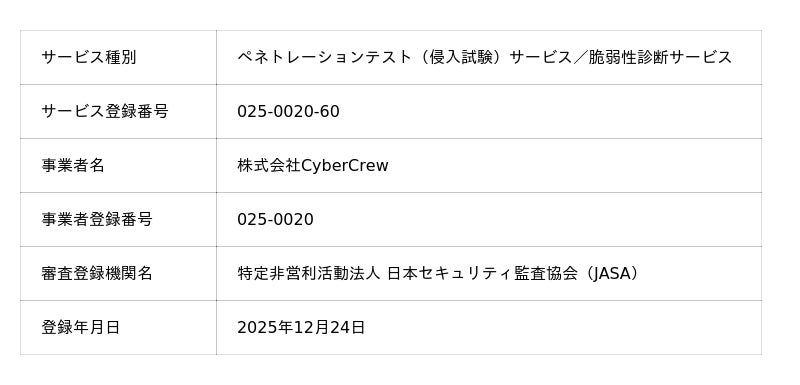 株式会社CyberCrew(本社:東京都千代田区、代表取締役:香川 健志、以下「当社」)は、 当社が提供する「ペネトレーションテストサービス」および「脆弱性診断サービス」が、経済産業省が策定した 「情報セキュリティサービス基準」に基づく審査を経て、「情報セキュリティサービス台帳」へ登録されたことを お知らせいたします。