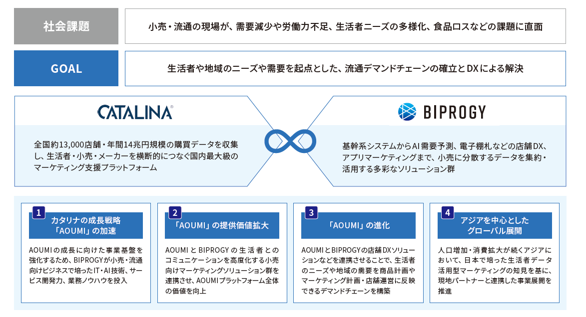 「AOUMI」の提供価値を高めるため、BIPROGYの小売向けリテールマーケティングソリューション群との連携を進めます。