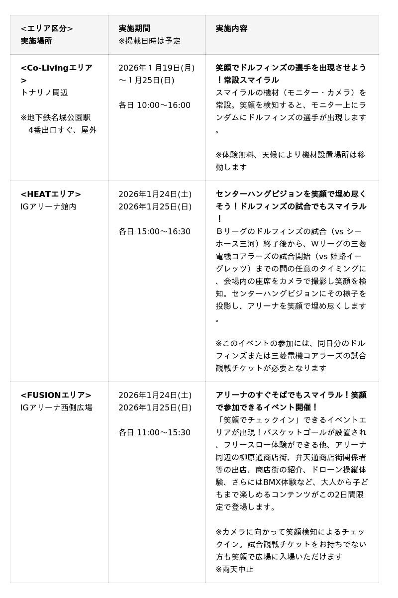 このたび、名古屋ダイヤモンドドルフィンズでは、1月24日(土).25日(日)、IGアリーナでのシーホース三河戦において、「Smile Economy PROJECT」の実証実験を行うことになりましたことをお知らせいたします。