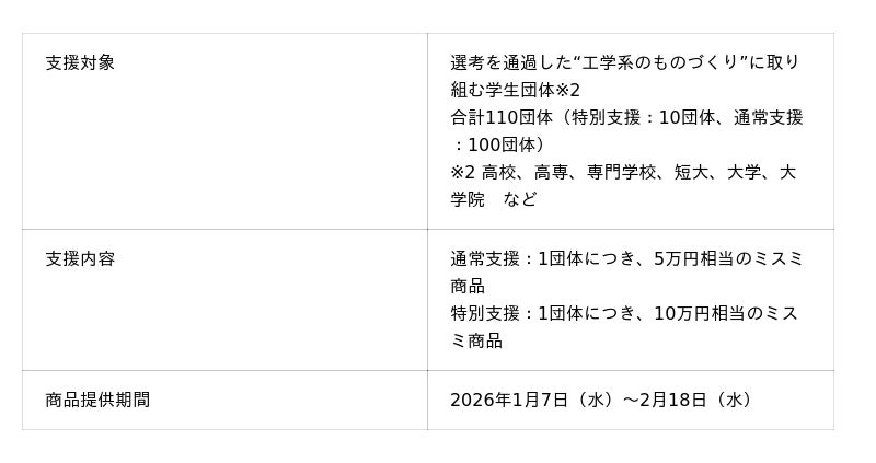 株式会社ミスミグループ本社(本社:東京都千代田区、代表取締役社長:大野龍隆)は、2025年度「ミスミ学生ものづくり支援」の選考を通過した学生団体への部品提供を、本日2026年1月7日(水)より開始します。